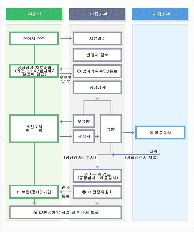 - 제품 심사 : 공장심사에 합격된 업체의 대상 품목에 대해 해당 KS표준 기준에 의거하여 제품시험(공인시험기관)을 통해 제품심사를 실시함.
