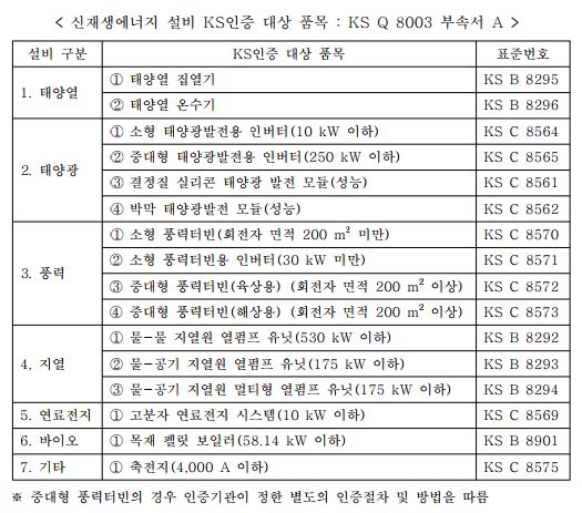 인증대상- 국가 신재생에너지 보급 목표의 효율적 달성과 공공의 안전성 및 소비자보호를 위하여 정부가 정한 KS표준에 맞는 제품의 생산과 유통의 필요성이있는 설비