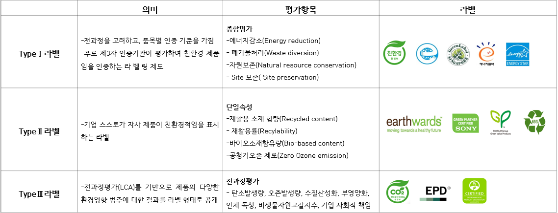 환경 라벨은 크게  Type I, II, III, 3가지로 나뉘고, 관련 국제 표준인 ISO 14020 시리즈에서 프레임워크를 규정합니다.